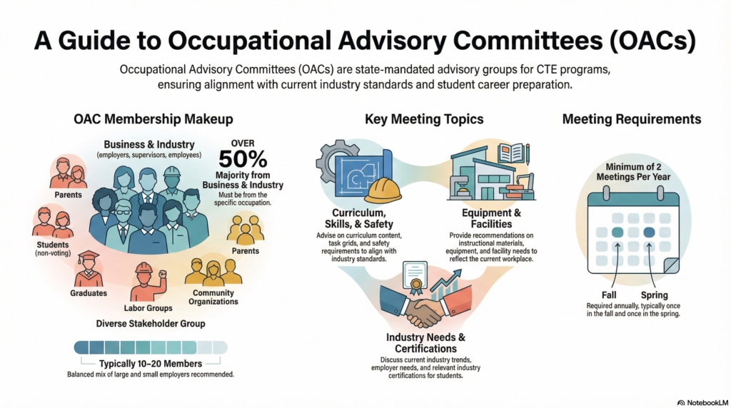 Maintaining an OAC is a collective responsibility, though the burden can be onerous for a CTE teacher who serves as the primary contact, recruiter, and facilitator. While the instructor is legally tasked with forming the group and managing daily interactions, the CTE director or principal must provide critical oversight by formally appointing members and ensuring that recommendations reach the school board for action. Delegating these tasks solely to the teacher risks “minimum compliance” rather than true program excellence, as administrative attendance at meetings is essential to provide the immediate feedback and “buy-in” that industry members expect. Ultimately, the most effective OACs function as a partnership where the teacher manages the technical relevance of the curriculum while the administration provides the organizational authority and logistical resources to sustain employer engagement.